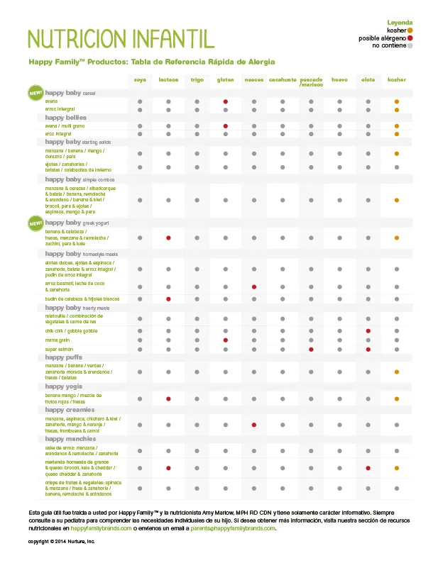 Si usted está retrasando o evitando un alimento en particular debido a la alergia o la intolerancia, revise la tabla de referencia rápida de Alergias de los productos Happy Baby que le presentamos a continuación: